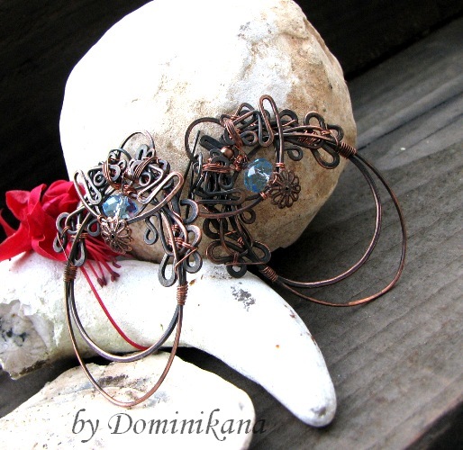 Kolczyki długie, wykonałam z oksydowanej miedzi, kropli fluorytu oraz kryształów Swarovski'ego - bicone w 3 odcieniach fioletu (light ametyst, ametyst, light rose) oraz fioletowej masy perłowej. Całość niesamowicie się mieni, błyszczy; Sylwestrowe bądź na inne uroczystości :)